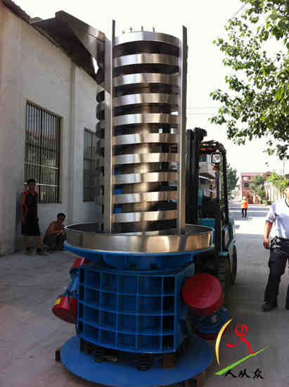 DZC電機(jī)振動(dòng)垂直提升機(jī)是由提升槽、振動(dòng)電機(jī)、減振系統(tǒng)和底座等組成。它采用振動(dòng)電機(jī)作為振動(dòng)源,固定在提升槽上的兩臺(tái)相同型號(hào)的振動(dòng)電機(jī)中心線交叉一定角度安裝,并做相反方向自同步旋轉(zhuǎn),振動(dòng)電機(jī)所帶的偏心塊在旋轉(zhuǎn)時(shí)各個(gè)瞬間位置所產(chǎn)生的離心力之分力沿拋擲方向作往復(fù)運(yùn)動(dòng),使支承在減振器上的整個(gè)機(jī)體不停振動(dòng),使物料在提升槽內(nèi)被拋起的同時(shí)向上運(yùn)動(dòng),物料落入入料槽后,開始被拋起,此時(shí)可以使物料與空氣充分接觸,還可以起到散熱冷卻的作用。當(dāng)垂直輸送機(jī)工作時(shí),根據(jù)雙振動(dòng)電機(jī)自同步原理,由振動(dòng)電機(jī)產(chǎn)生激振力,使整個(gè)輸送塔體作水平圓運(yùn)動(dòng)和向上垂直運(yùn)動(dòng)的空間復(fù)合振動(dòng),螺旋槽內(nèi)的物料則受輸送槽的作用,作勻速拋擲圓運(yùn)動(dòng),沿輸送槽體向上運(yùn)動(dòng),從而完成物料的向上(或向下)輸送作業(yè)。