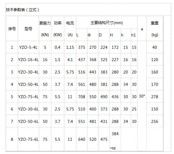 YZO振動電機型號主要有:YZO-5-4L、YZO-16-4L、YZO-30-4L、YZO-50-4L、YZO-75-4L、YZO-30-6L、YZO-50-6L、YZO-75-6L、YZO-100-6L等。