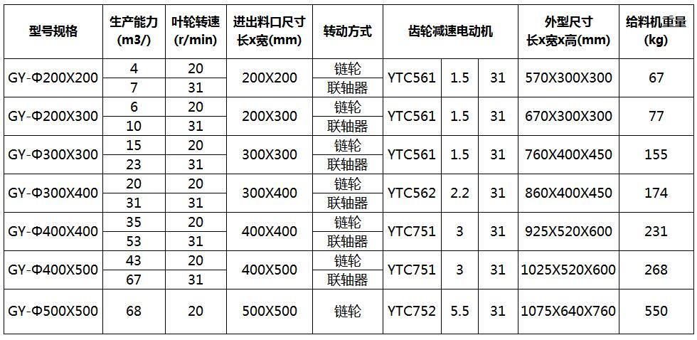 GY剛性葉輪給料機(jī)技術(shù)參數(shù):